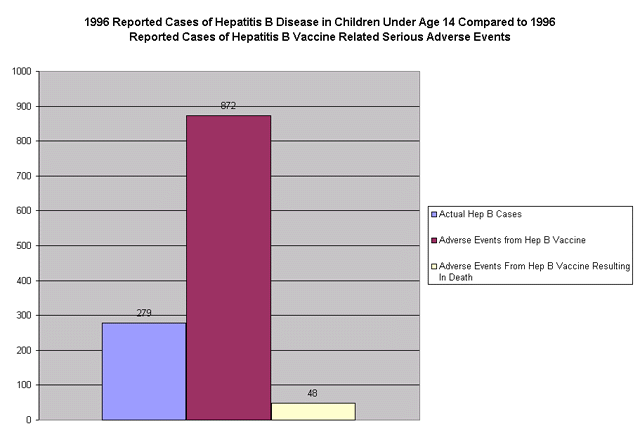 Independent analysis of raw computer data generated by the government-operated Vaccine Adverse Event Reporting System (VAERS) confirms that in 1996, there were 872 serious adverse events reported to VAERS in children under 14 years of age who had been injected with hepatitis B vaccine. The children were either taken to a hospital emergency room, had life threatening health problems, were hospitalized or were left disabled following vaccination. 214 of the children had received hepatitis B vaccine alone and the rest had received hepatitis B vaccine in combination with other vaccines. 48 children were reported to have died after they were injected with hepatitis B vaccine in 1996 and 13 of them had received hepatitis B vaccine only before their deaths. By contrast, in 1996 only 279 cases of hepatitis B disease were reported in children under age 14. (Click here to see graph)