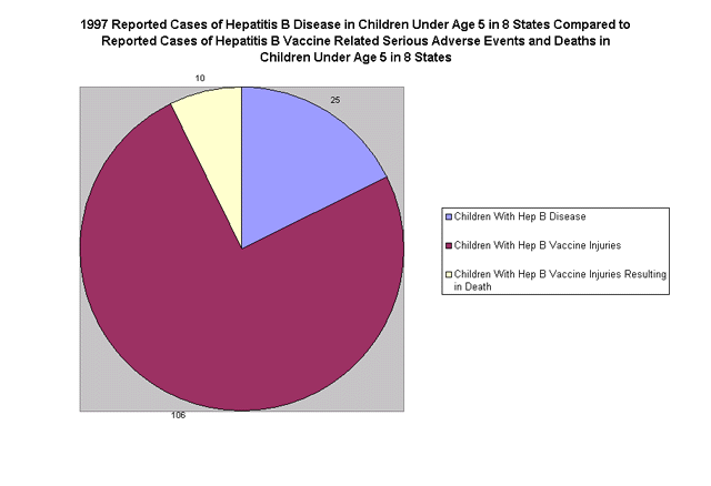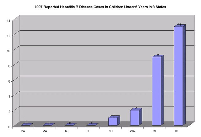 1997 hepatitis B disease statistics from eight states reinforce the lack of hepatitis B disease in young children, particularly in children under 5 years old. For children under 5 years old, New Hampshire reported 1 case of hepatitis B; Washington state reported 2 cases; Michigan reported 9 cases; and Texas reported 13 cases. Pennsylvania, Massachusetts, New Jersey and Illinois reported no hepatitis B cases in children under 5 years old.(Click here to see graph) By contrast, in 1997 there were a total of 106 VAERS reports of hepatitis B vaccine-related serious adverse events and 10 deaths in children under age 5 living in the eight states with 13 of the reported serious adverse events and 2 deaths occurring in children receiving only hepatitis B vaccine. (Click here to see graph)