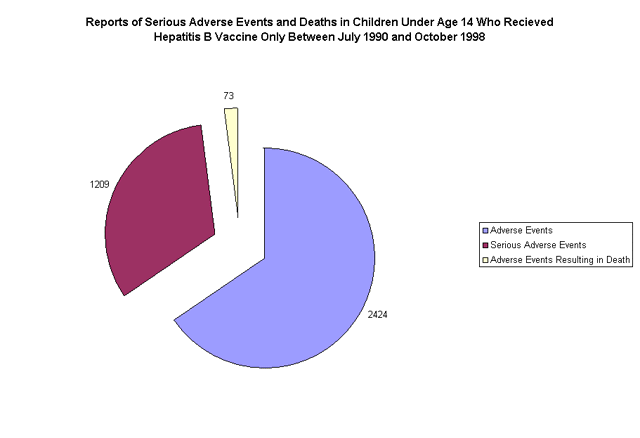 During the same time period, there was a total of 2,424 adverse event reports, with 1,209 serious events and 73 deaths in children under age 14 who got hepatitis B vaccine alone without any other vaccines. This means that 52 percent or 1 out of 2 reports for children under age 14, who only receive hepatitis B vaccine, are for serious events.